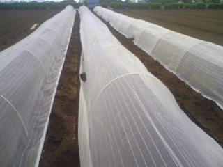 っと芽が出てきたんで寒冷紗をかけます!!