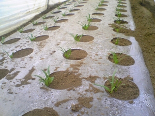 マルチの端っこから芽が出てます。機械の調整ミスです。。。
