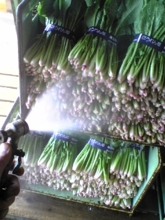 その束ねたホウレンソウを「らくらく」っていうケースに入れて根っこを洗います。