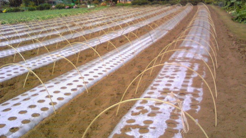 ホウレンソウにトンネルをかけるために支柱を組み立ててました。