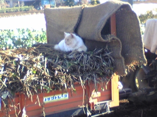 途中、ノラ猫ちゃんは疲れたみたいで取れたゴボウの上で応援です♪